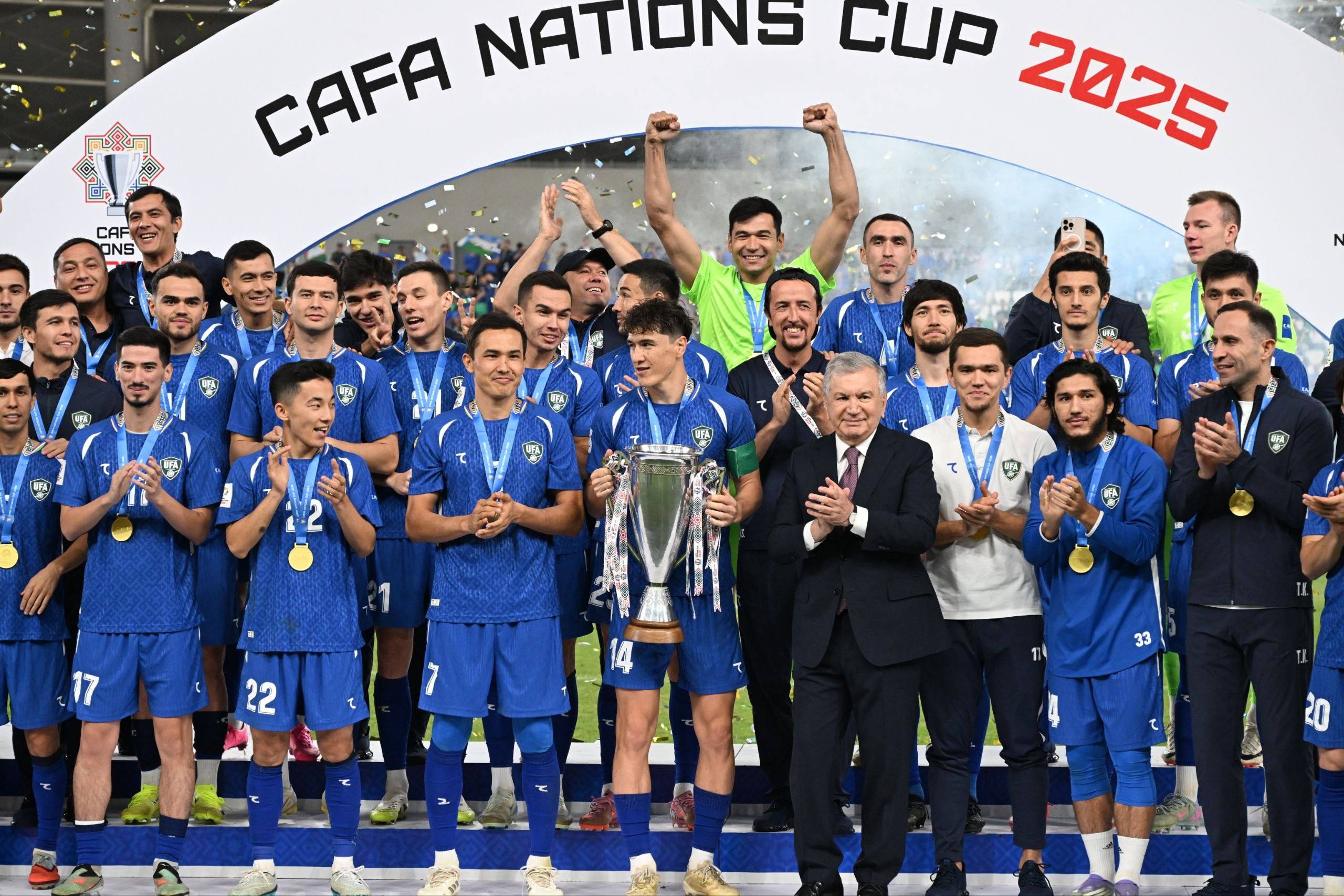 CAFA Nations Cup-2025 gʻolibi Oʻzbekiston terma jamoasini Oʻzbekiston Respublikasi Prezidenti, MOQ raisi Shavkat Mirziyoyev hamda FIFA Prezidenti Janni Infantino taqdirlashdi