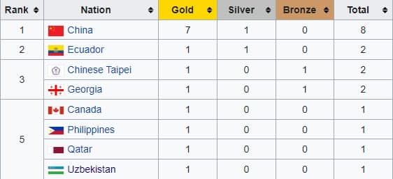 Bu borada xitoylik atletlar yakka peshqadam bo'lishdi. Ishtirok etgan 8 sportchisidan 7 tasi chempionlikni qo'lga kiritgan bo'lsa, 1 nafari kumush medal bilan taqdirlandi. Biz esa Akbar Jo'raevning Olimpiada rekordi bilan kuchli beshlikdan joy oldik.
