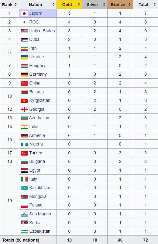 Ushbu sport turida ayollar kurashidagi ustunlik musobaqa mezbonlarini birinchi o'ringa ko'tarib yubordi. Etakchilar qatoridan roq va AQSh vakillari ham joy olishdi. O'zbekiston termasi Bekzod Abdurahmonovning shohsupaga ko'tarilgani evaziga medalchilar qatorini yakunlab turibdi.