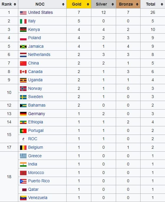 Shuncha sport turlari haqida gapirganda "Sport qirolichasi"ni yoddan ko'tarish mumkin emas. Kutilganidek, bu dasturda ham AQSh etakchilik qildi. Ushbu sportda oxirgi medali London-2012, so'nggi oltin medali Pekin-2008 Olimpiadasiga to'g'ri keladigan italiyaliklar bu gal 5 ta oltin medal bilan umumjamoa hisobida ikkinchi o'rinni qo'lga kiritgani o'zlari uchun ham kutilmagan g'alaba bo'ldi, deyish mumkin. Kuchli uchlikni keniyaliklar yakunlab berishdi.