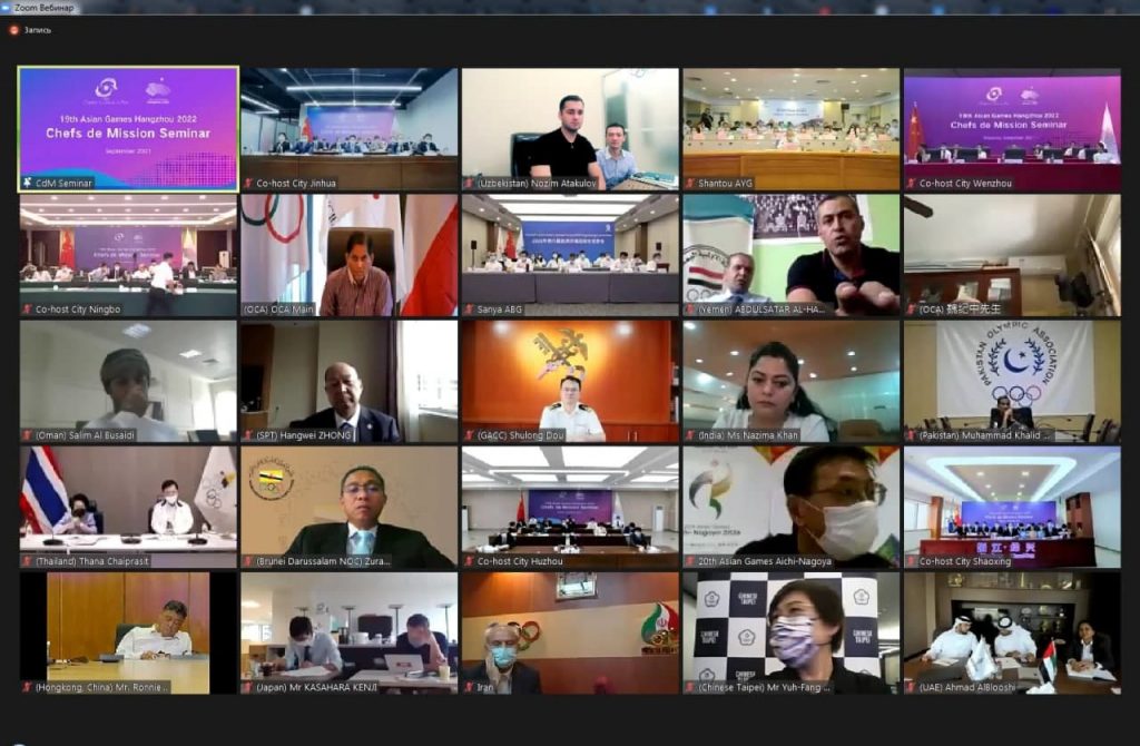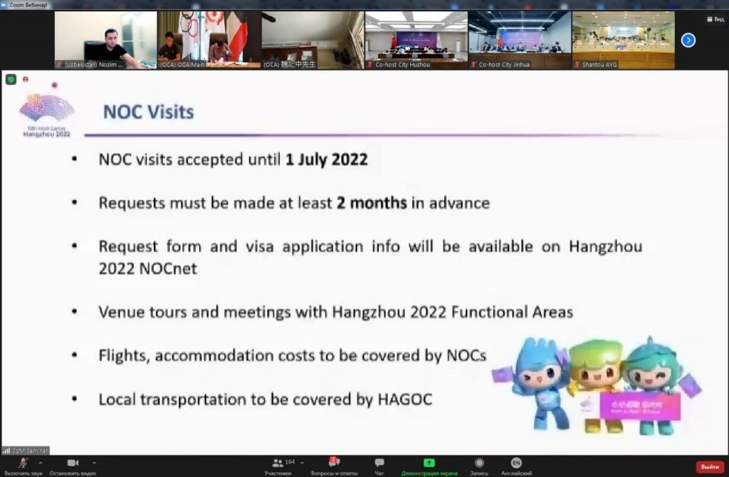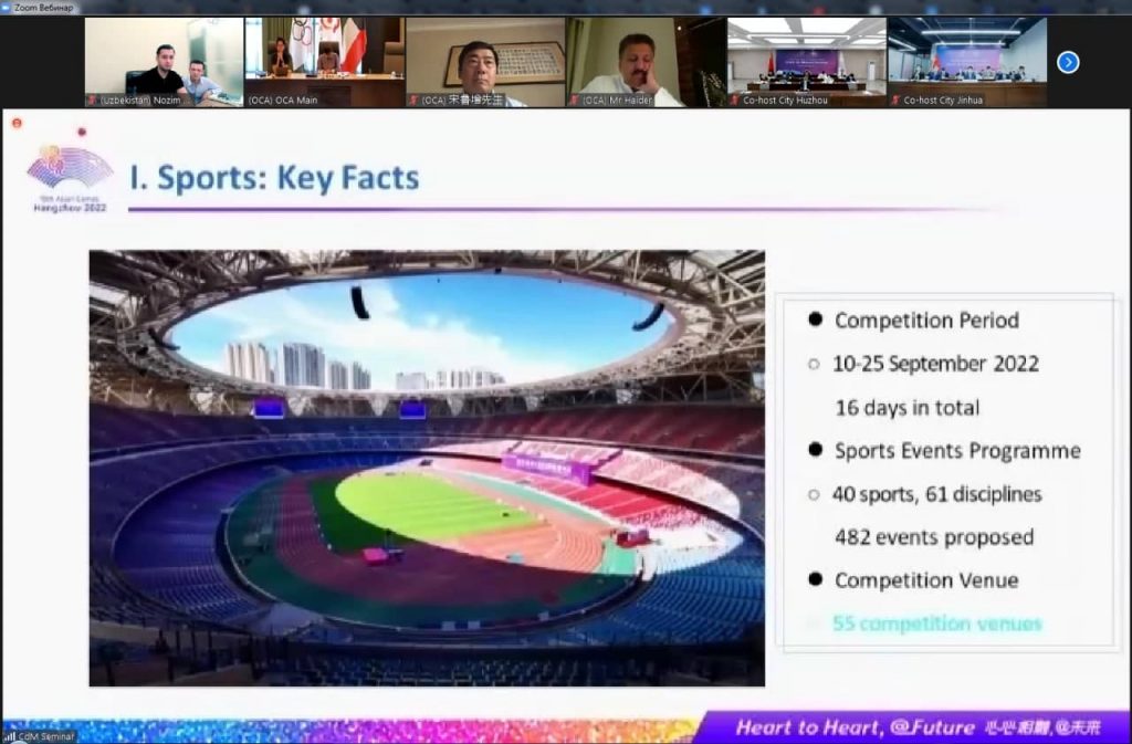 8-9-sentyabr kunlari Xanchjou-2022 Osiyo oʻyinlarining bir qator tashkiliy masalalari yuzasidan onlayn seminar boʻlib oʻtdi. Unda Osiyo Olimpiya kengashi va musobaqa tashkiliy qoʻmitasi rahbariyati, Osiyo-Okeaniya Milliy Olimpiya qoʻmitalarining vakillari qatnashishdi.