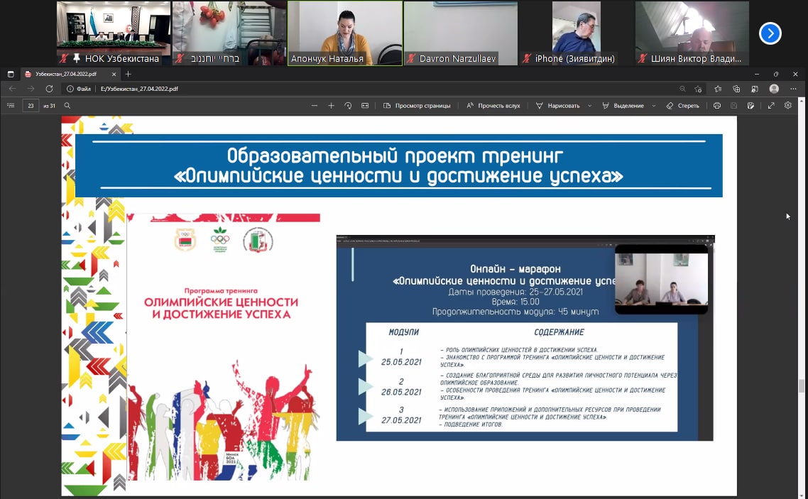 Ma’lum qilganimizdek, bugun “ZOOM” platformasi orqali “Olimpiya sportida zamonaviy ilm-fan” mavzusidagi xalqaro ilmiy anjuman o‘tkazildi. Unda MOQ Bosh kotibi Oybek Kasimov, pedagogika fanlari doktori, professor Fikrat Kerimov, Germaniya, Ukraina, Belarus, Rossiya va Isroil davlatlaridan ulangan, shuningdek, mamlakatimizda faoliyat olib borayotgan olimlar ishtirok etishdi.
