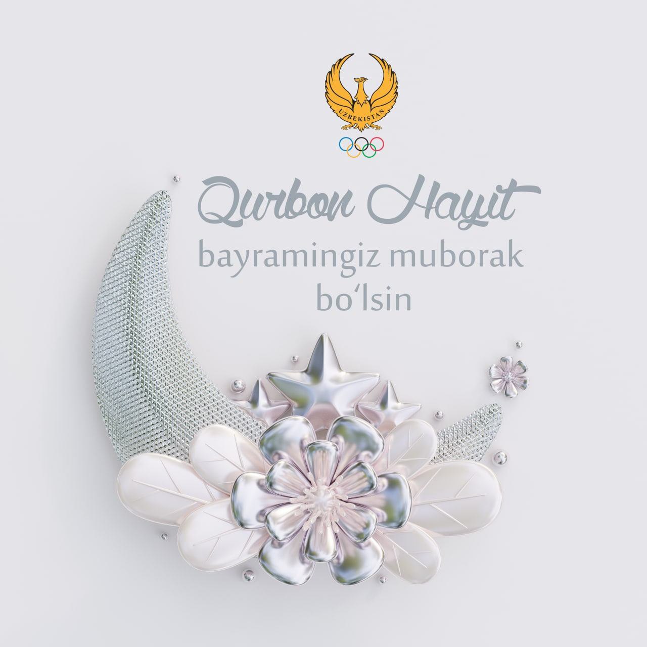 Qadrli yurtdoshlar, O‘zbekiston Milliy Olimpiya qo‘mitasi Sizlarni kirib kelgan Qurbon Hayiti bilan samimiy qutlab qoladi. Barchangizning xonadoningizni to‘kin-sochinlik, qut-baraka, taningizni sihat-salomatlik aslo tark etmasin!