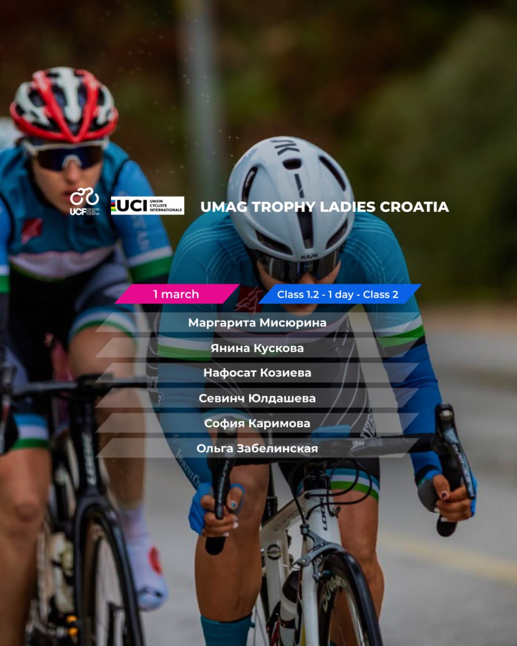 1-mart kuni boʻlib oʻtadigan “Umag Trophy LADIES Croatia” poygasi 112 km, 5-mart kuniga belgilangan “Poreč Trophy LADIES Croatia” esa 96 km masofani oʻz ichiga oladi. Jamoamiz tarkibidan tajribali Olga Zabelinskaya qatori Yanina Kuskova, Margarita Misyurina, Sevinch Yoʻldosheva, Sofiya Karimova hamda Nafosat Qoʻziyeva joy olgan. Musobaqa jahon va Parij-2024 Olimpiadasi reytingi uchun qimmatli ochkolarini taqdim qiladi.