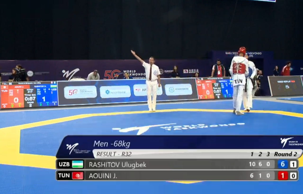 Hamyurtimiz Ulugʻbek Rashitov Bokudagi jahon chempionatida yana bir gʻalabani qoʻlga kiritdi. -68 kg vazn toifasida ishtirok etayotgan taekvondochimiz uchinchi davrada tunislik Yasir Aounini musobaqadan chiqarib yubordi.