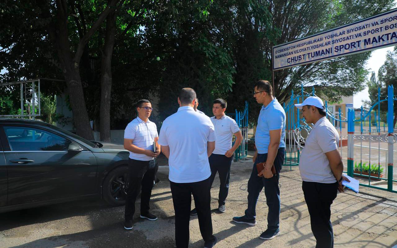 Dastavval, viloyat Yoshlar siyosati va sport boshqarmasi rahbariyati mavzu boʻyicha hududlarda olib borilayotgan ishlar bilan tanishtirdi. Shundan soʻng ishchi guruh Pop, Davlatobod, Yangi Namangan, Chust tumanlari va Namangan shahriga borib, u yerlardagi sport maktablari va obyektlarning faoliyatini oʻrgandi. Pop tumanida qurilayotgan 2-BOʻSM mutasaddilarning eʼtiborini jalb etdi. 5000 metr kvadrat maydonni egallaydigan ushbu maskanda yoshlarning sport bilan shugʻullanishlari uchun barcha sharoitlar yaratiladi.
