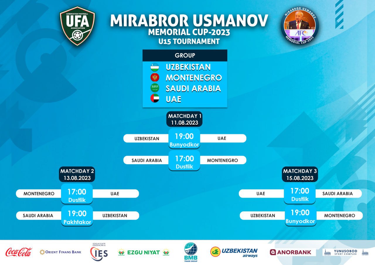 Musobaqaning ochilish oʻyini 11-avgust kuni “Bunyodkor” stadionida oʻtkaziladi. Unda yosh hamyurtlarimiz BAA vakillariga qarshi maydonga tushishadi. Barcha muxlislarni yurtimiz futbolining ertangi yulduzlarini kashf qilib beradigan ushbu xotira turniriga taklif etamiz. Hamma uchrashuvlarga kirish bepul. Taqvim: