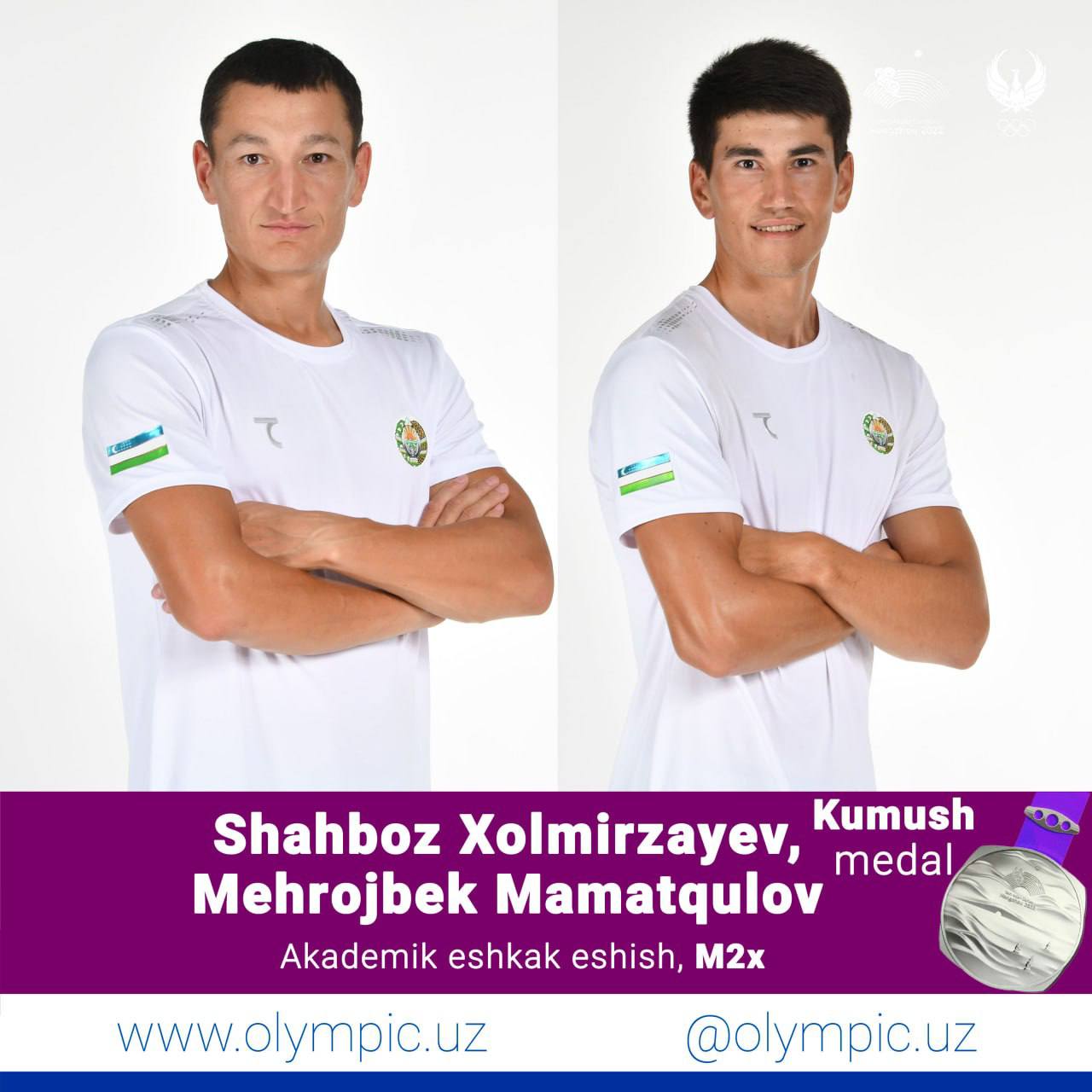 Akademik eshkak eshish bahslarida ishtirok etayotgan sportchilarimiz har bir startda shohsupaga ko'tarilishmoqda. Bu gal M2x dasturida ishtirok etgan Shahboz Xolmirzayev hamda Mehrojbek Mamatqulov juftligi kumush medalini qo'lga kiritdi. Mazkur startda oltin medal Xitoy, bronza medali esa Indoneziyaga nasib etdi.