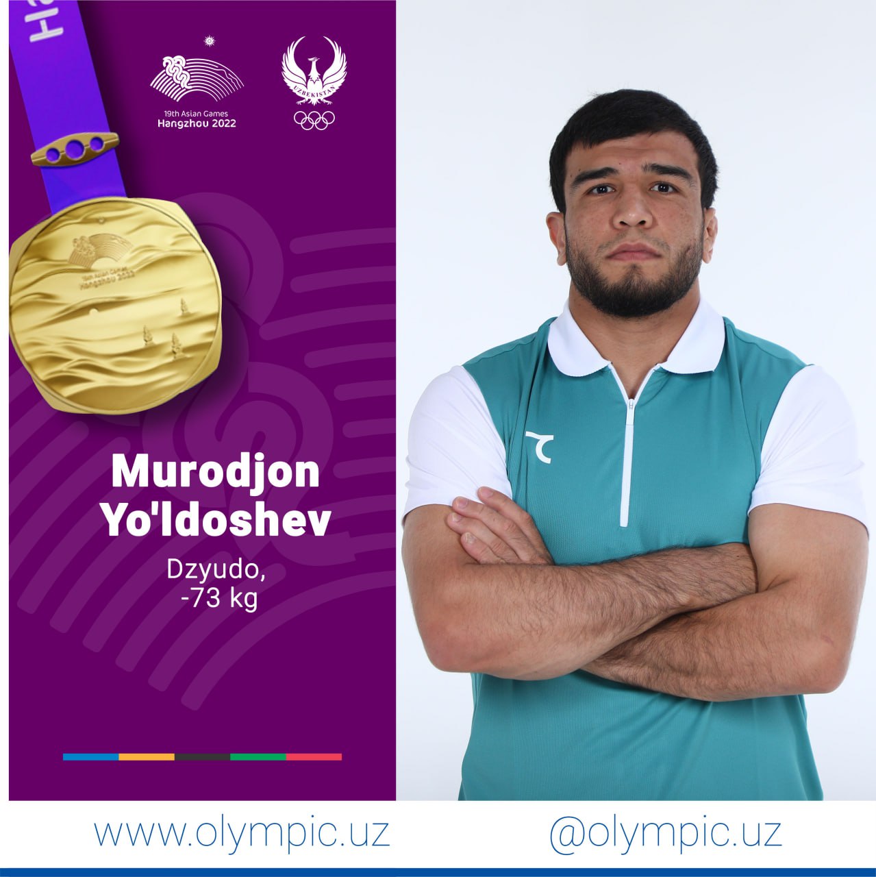 Murodjon Yoʻldoshev Oʻzbekiston delegatsiyasi uchun bugun uchinchi, umumiy hisobda esa toʻrtinchi oltin medalni taqdim qildi. -73 kg vazn toifasining chempionlik bahsida tatamiga chiqqan Yoʻldoshev yaponiyalik Soichi Xashimotoni magʻlubiyatga uchratishga muvaffaq boʻldi. Barakalla, Murodjon!