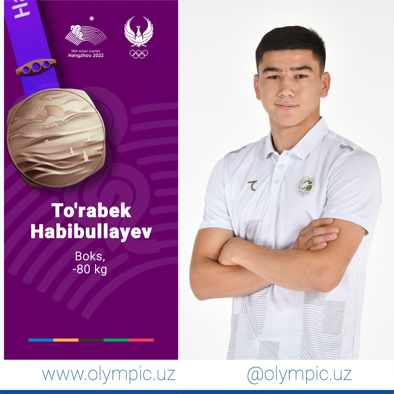 Mahoratli yosh bokschimiz Toʻrabek Habibullayev Osiyo oʻyinlari sovrindoriga aylandi. -80 kg vazn toifasida ishtirok etayotgan hamyurtimiz yarim finalda xitoylik Tanglatixan Toʻxtarbekka qarshi ringga koʻtarildi. Qiziqarli jang mezbon bokschining gʻalabasi bilan yakunlandi va yurtdoshimiz Osiyo oʻyinlarining bronza medalini qoʻlga kiritdi.