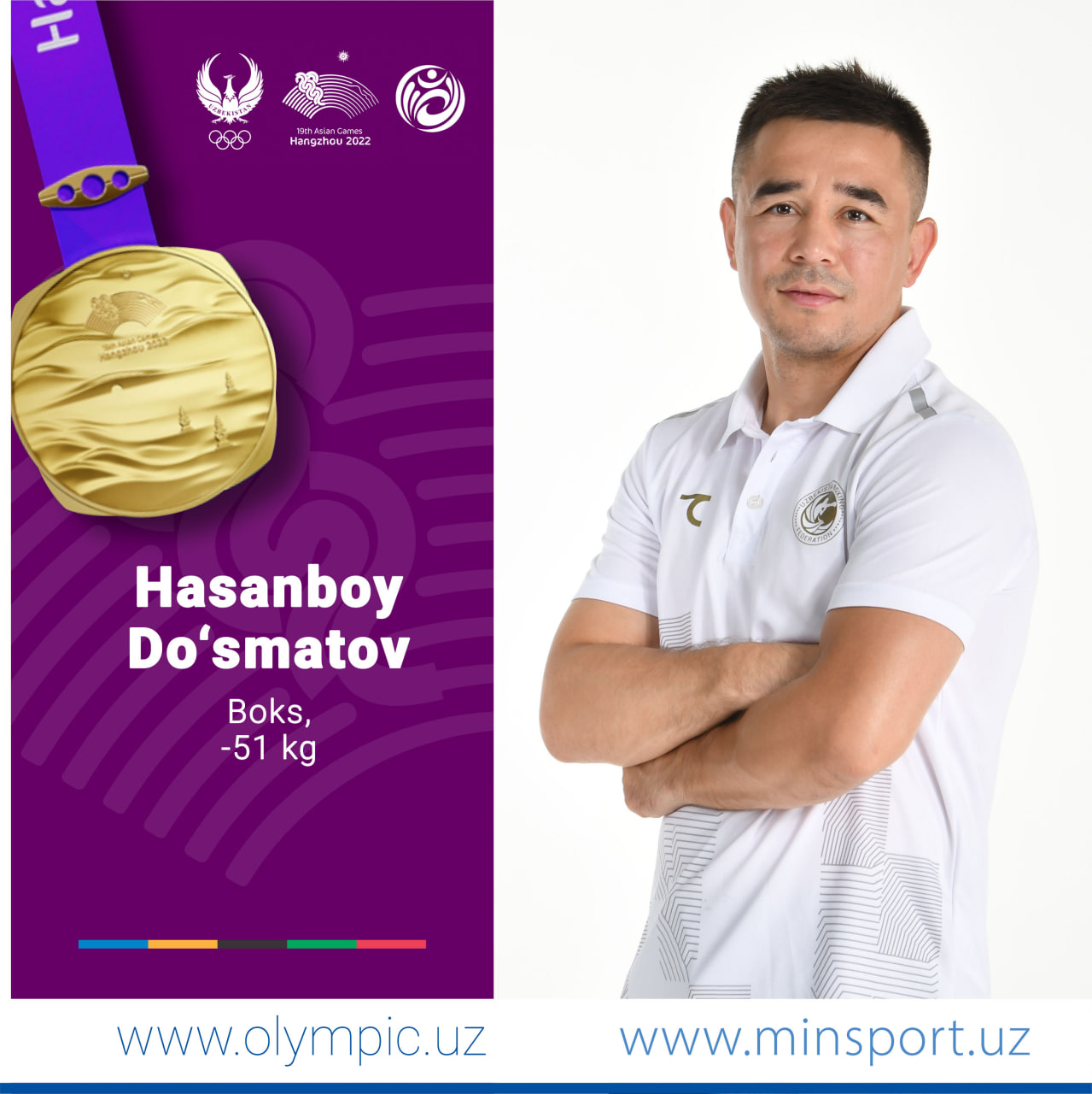 Boks bo’yicha O’zbeksiton terma jamoasi a’zosi Hasanboy Do’smatov (-51 kg) o’z sovrinlari orasiga Osiyo o’yinlarining oltin medalini qo’shib qo’ydi. Hamyurtimiz murosasiz kechgan final jangida tailandlik Thitisan Panmotni mag’lubiyatga uchratishga erishdi. Endi Hasanboyda har bir bokschi erishishi mumkin bo’lgan titullar to’liq ko’rinishga keldi!