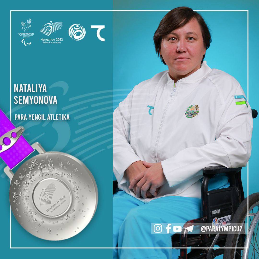 Para-yengil atletika bo’yicha O’zbekiston terma jamoasi a’zosi Natalya Semyonova O’zbekiston delegatsiyasiga yana bir medal keltirdi. Ayollar o‘rtasida F56 klassida nayza uloqtirish dasturida ishtirok etgan hamyurtimiz 17.40 metr natija bilan kumush medalni qo‘lga kiritdi.