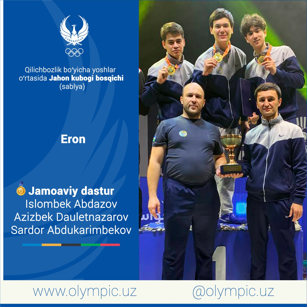 Jamoaviy dasturda ishtirok etgan Islombek Abdazov, Azizbek Dauletnazarov hamda Sardor Abdukarimbekov triosi barcha raqiblarni mag‘lubiyatga uchratishga muvaffaq bo‘ldi. Chempionlik uchun kechgan final bellashuvida yigitlarimiz Turkiya jamoasini 45:42 hisobida dog‘da qoldirishdi. Qayd etish joiz, jamoa yetakchisi Islombek Abdazov yakkalik bosqichida ham oltin medalni qo‘lga kiritgan edi.
