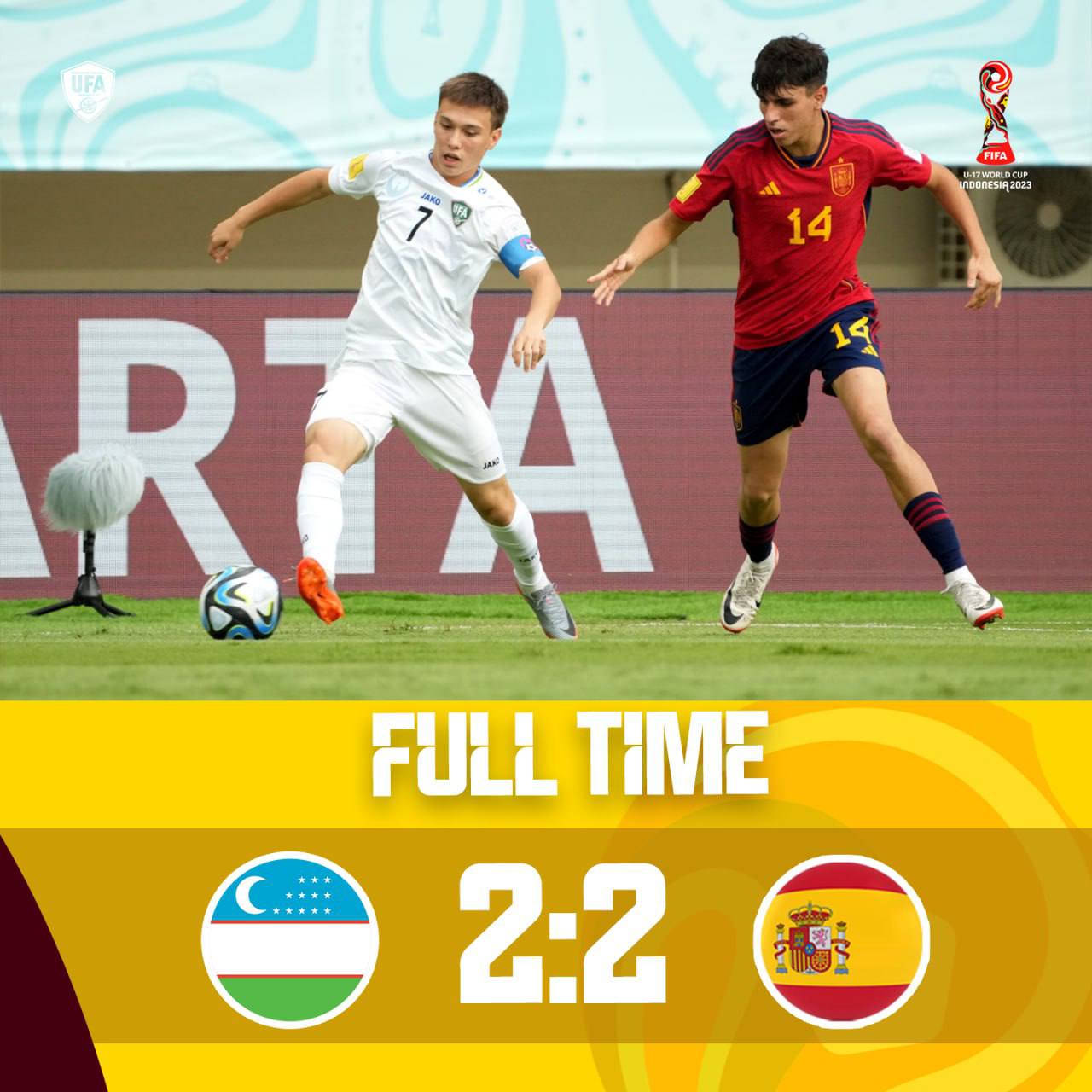 Futbol boʻyicha Oʻzbekiston U-17 terma jamoasi Indoneziyada oʻtayotgan jahon chempionatida guruh bosqichidagi ishtirokini yakunladi. Soʻnggi turda Ispaniyaga qarshi maydonga tushgan yurtdoshlarimiz nomdor raqiblari bilan 2:2 hisobidagi durangga imzo chekishdi. Shu tariqa, 4 ochko jamg’argan jamoamiz “В” guruhida uchinchi oʻrinni egalladi. Yigitlarimizning pley-off bosqichiga chiqish masalasi guruh bosqichi yakunlanganidan soʻng maʼlum boʻladi.