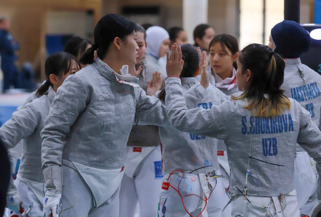 Bugun tashkil etilgan jamoaviy dasturda ham qizlarimiz yuksak mahoratlarini namoyish etib, barcha raqiblarini magʻlubiyatga uchratishdi va oltin medallarni qoʻlga kiritishdi. Hamyurtlarimiz yarim finalda Janubiy Koreyani 45:26, final bahsida esa Qozog’istonni 45:37 hisobida dogʻda qoldirishdi.