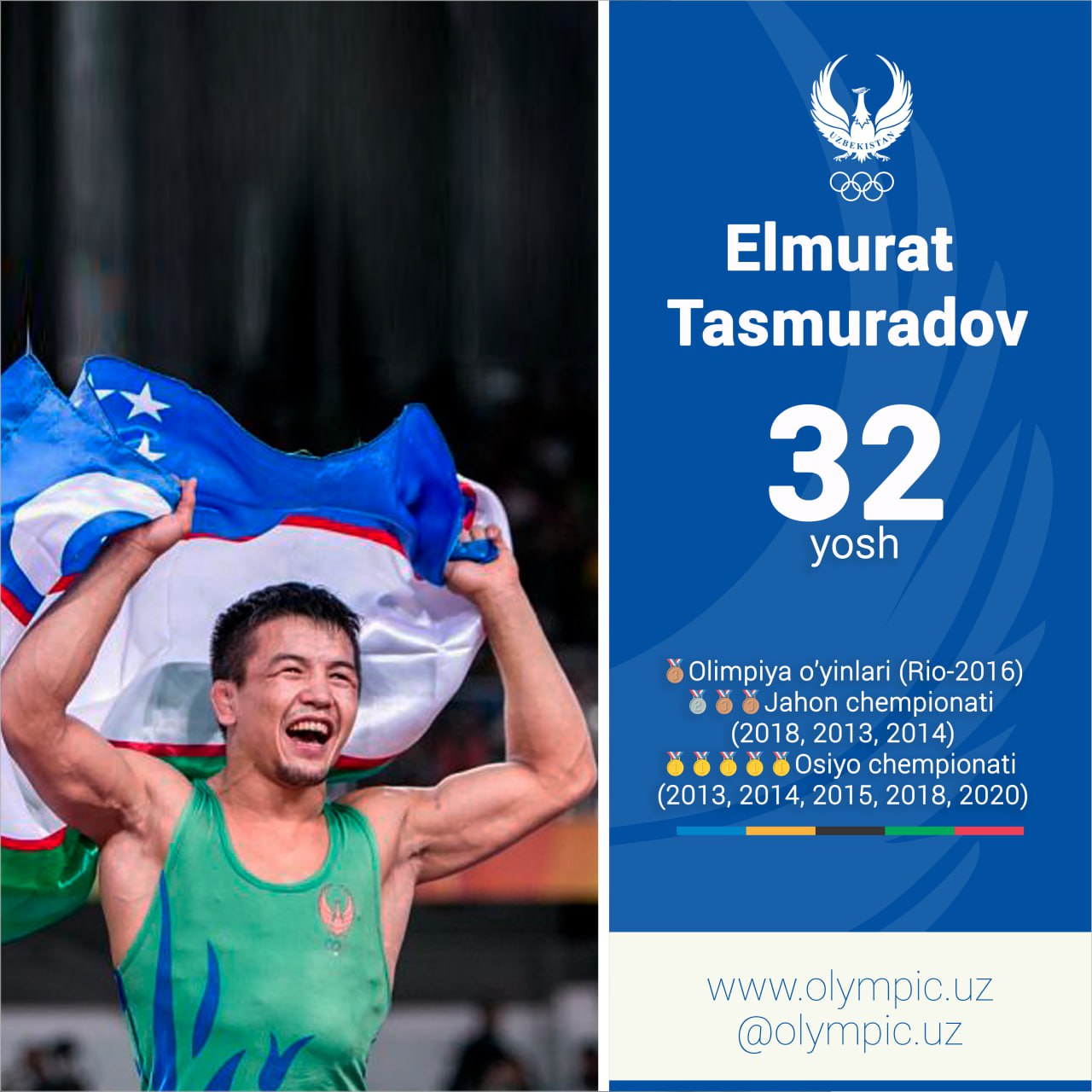 Oʻzbekiston Milliy Olimpiya qoʻmitasi yunon-rum kurashi boʻyicha Rio-2016 Olimpiya oʻyinlari bronza medali egasi, 3 karra jahon chempionati sovrindori, 5 karra Osiyo chempioni, “Mehnat shuhrati” ordeni sohibi Elmurat Tasmuradovni tavallud ayyomi bilan tabriklab, unga uzoq umr va sihat-salomatlik tilab qoladi.