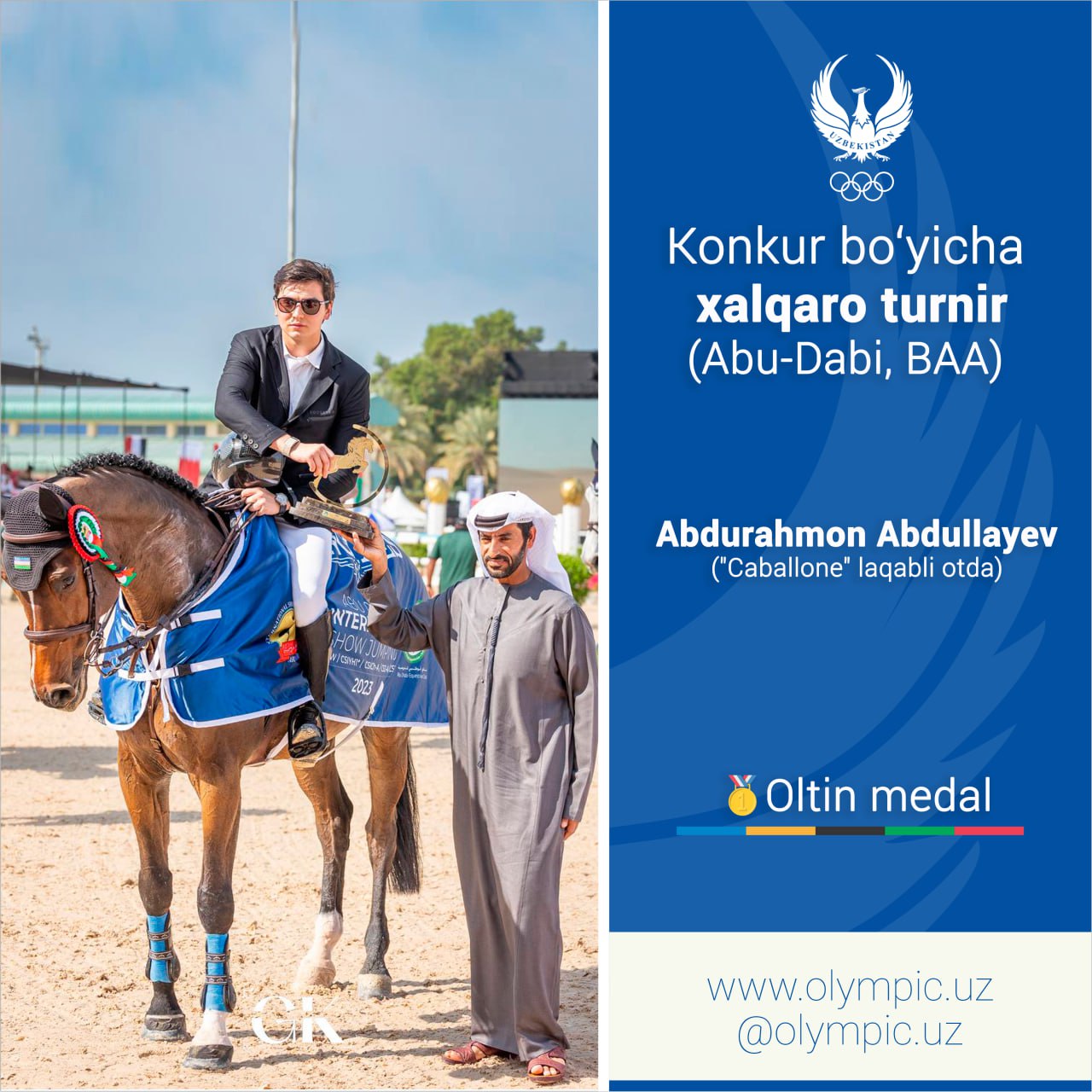BAAning Abu-Dabi shahrida ot sportining konkur yoʻnalishi boʻyicha CSI 4*-W tasnifidagi musobaqa yakunlandi. Turnirning soʻnggi kuni Oʻzbekiston terma jamoasi uchun muvaffaqiyatli oʻtdi.