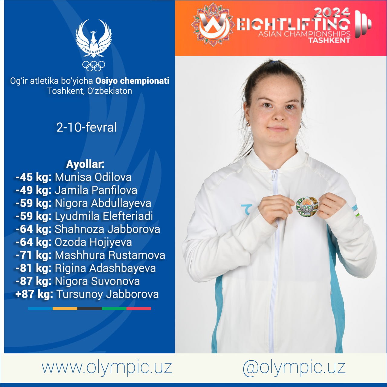 Oʻzbekiston ogʻir atletika federatsiyasi mazkur chempionatda ishtirok etadigan sportchilarimiz nomini eʼlon qildi. Unda 15 yoshli iqtidorli yosh atletlardan tortib, Ruslan Nurudinov, Akbar Joʻrayev kabi Olimpiada chempionlarining nomlarini ham uchratish mumkin. Toʻliq tarkib quyidagicha: