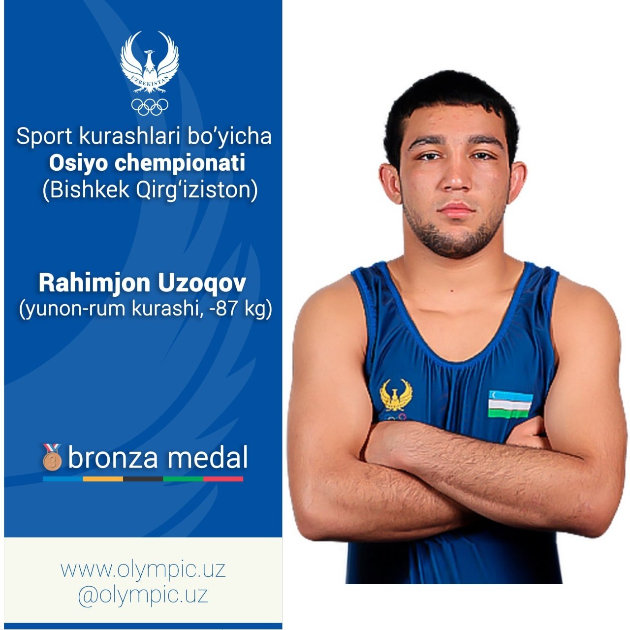 Qirgʻizistonda oʻtayotgan sport kurashlari boʻyicha qitʼa birinchiligida navbatdagi medal. -87 kg vazn toifasida qatnashgan yunon-rum kurashchimiz Rahimjon Uzoqov uchinchi oʻrin uchun kechgan bahsda janubiy koreyalik Seung Xvan Lini magʻlubiyatga uchratdi va bronza medalini qoʻlga kiritdi.