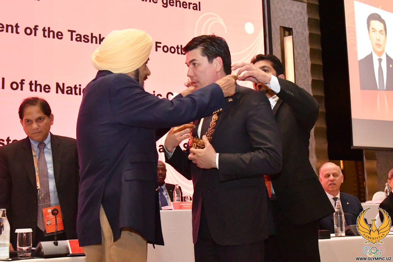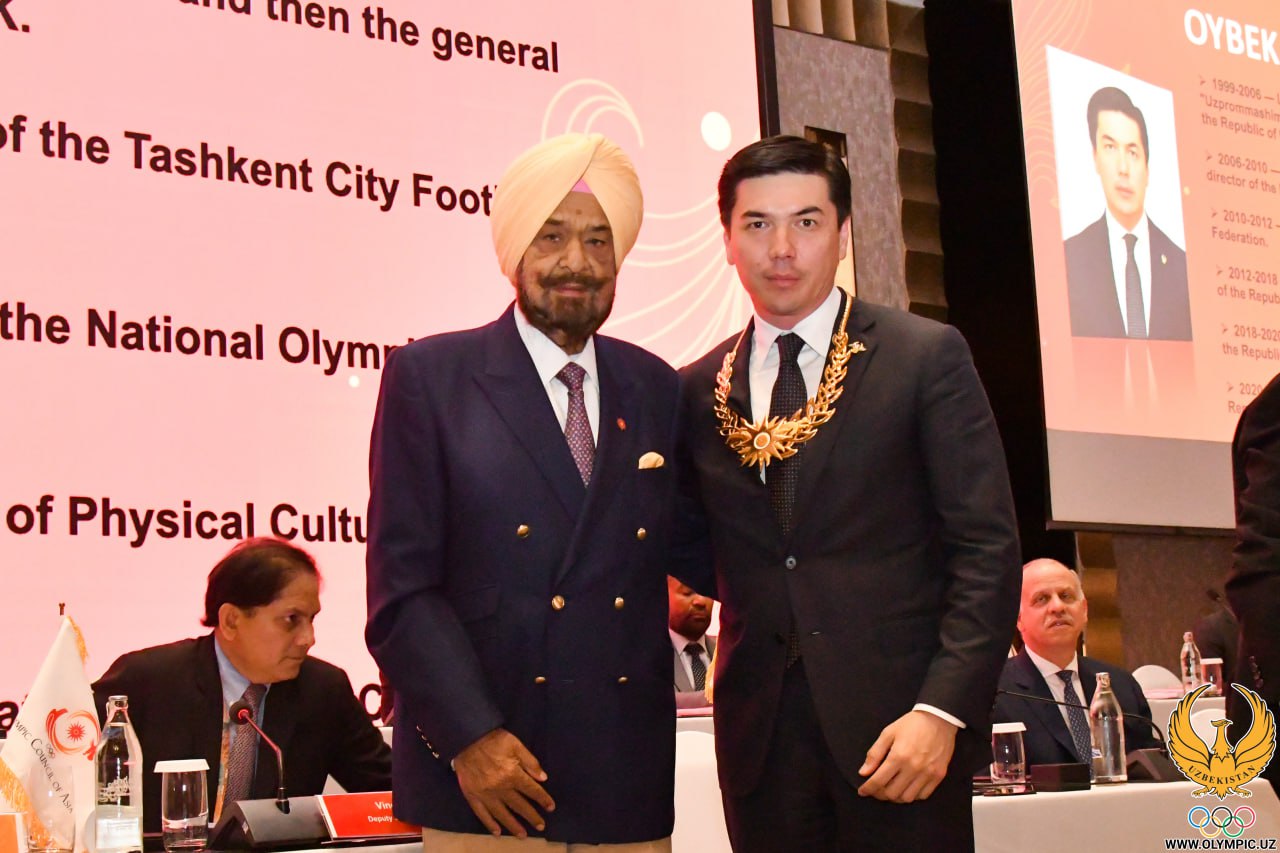 Shundan soʻng uzoq yillar qitʼamizda Olimpiya harakati rivojiga hissa qoʻshgan mutasaddilarga OOKning eng nufuli sovrini – “Buyuk xizmatlari uchun” ordeni topshirildi. Ahamiyatlisi, ulardan biri Oʻzbekiston Milliy Olimpiya qoʻmitasi Bosh kotibi Oybek Kasimovga tantanali ravishda taqdim etildi. Oybek Omilovich mukofotni Raja Randxir Singxdan qabul qilib oldi.