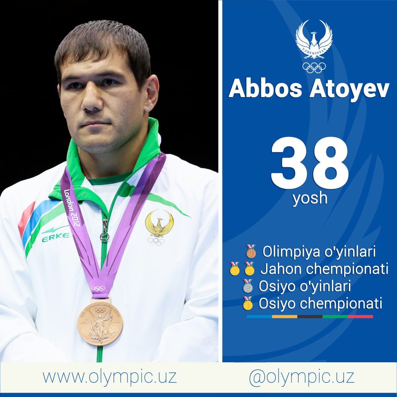 Bugun boks boʻyicha London-2012 yozgi Olimpiya oʻyinlarining bronza medali sohibi, ikki karra jahon chempioni, Osiyo oʻyinlarining kumush va qitʼa chempionatining oltin medali sohibi, “Oʻzbekiston Respublikasida xizmat koʻrsatgan sportchi” va “Oʻzbekiston iftixori” faxriy unvonlari sohibi Abbos Atoyev, shuningdek, dzyudo boʻyicha Tokio-2020 yozgi Olimpiya oʻyinlarining bronza medali sohibi, jahon chempionatlarining 1 tadan oltin, kumush va bronza medallari egasi, Osiyo oʻyinlarining ikki karra kumush medali sovrindori va Osiyo chempioni, “I darajali sogʻlom avlod uchun” ordeni va “Oʻzbekiston Respublikasida xizmat koʻrsatgan sportchi” faxriy unvoni sohibi Davlat Bobonov tavallud ayyomini nishonlamoqda.