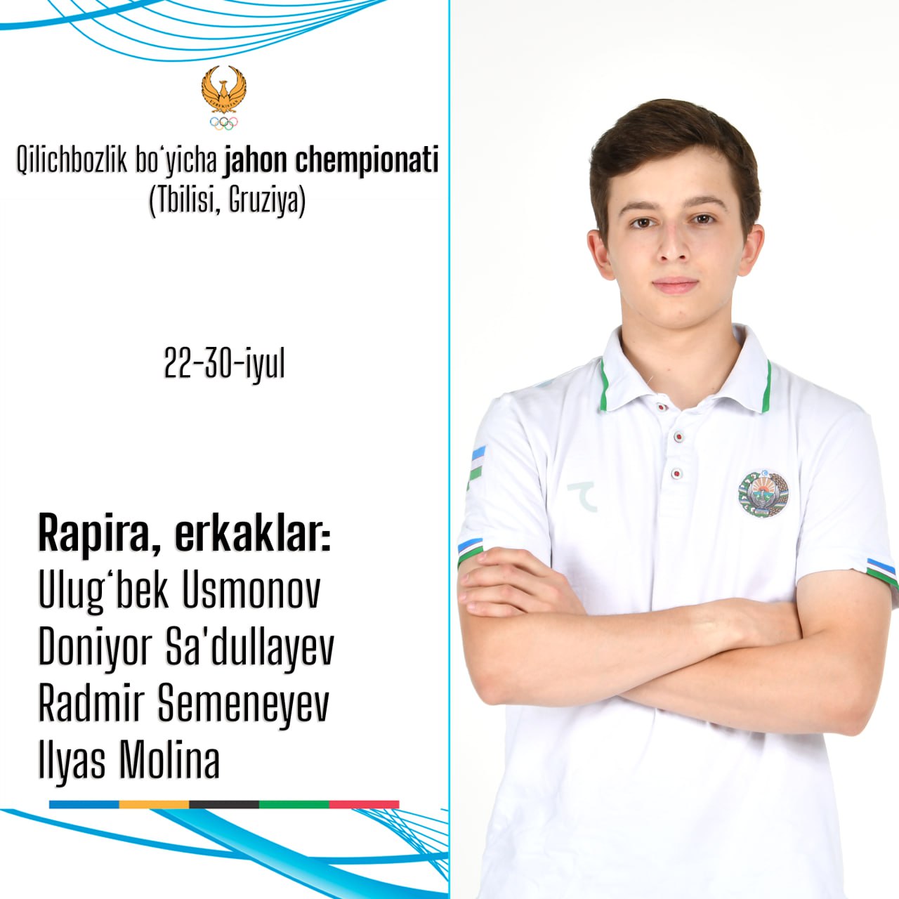 22-30-iyul kunlari Gruziyaning Tbilisi shahrida qilichbozlik boʻyicha jahon chempionati boʻlib oʻtadi. Oʻzbekiston qilichbozlik federatsiyasi mazkur musobaqada ishtirok etadigan terma jamoamiz tarkibini maʼlum qildi. Unga koʻra, quyidagi sportchilar boʻlajak dunyo birinchiligida ishtirok etadi: