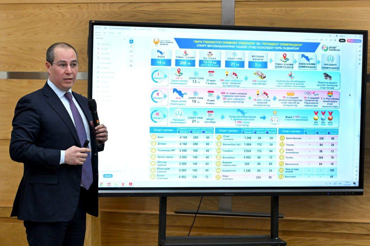 Mazkur tadbirda tuman hokimlari, poytaxtimizdagi oliy oʻquv yurtlari rektorlari hamda qator mutasaddi tashkilotlar vakillari ishtirok etishdi. Yigʻilishda “Yangi Oʻzbekiston Olimpiya choʻqqilari”, “Yangi Oʻzbekiston talabalar Olimpiadasi”, “Besh tashabbus Olimpiadasi” kabi ommaviy sport musobaqalarini tashkil etishga doir masalalar atroflicha koʻrib chiqildi.