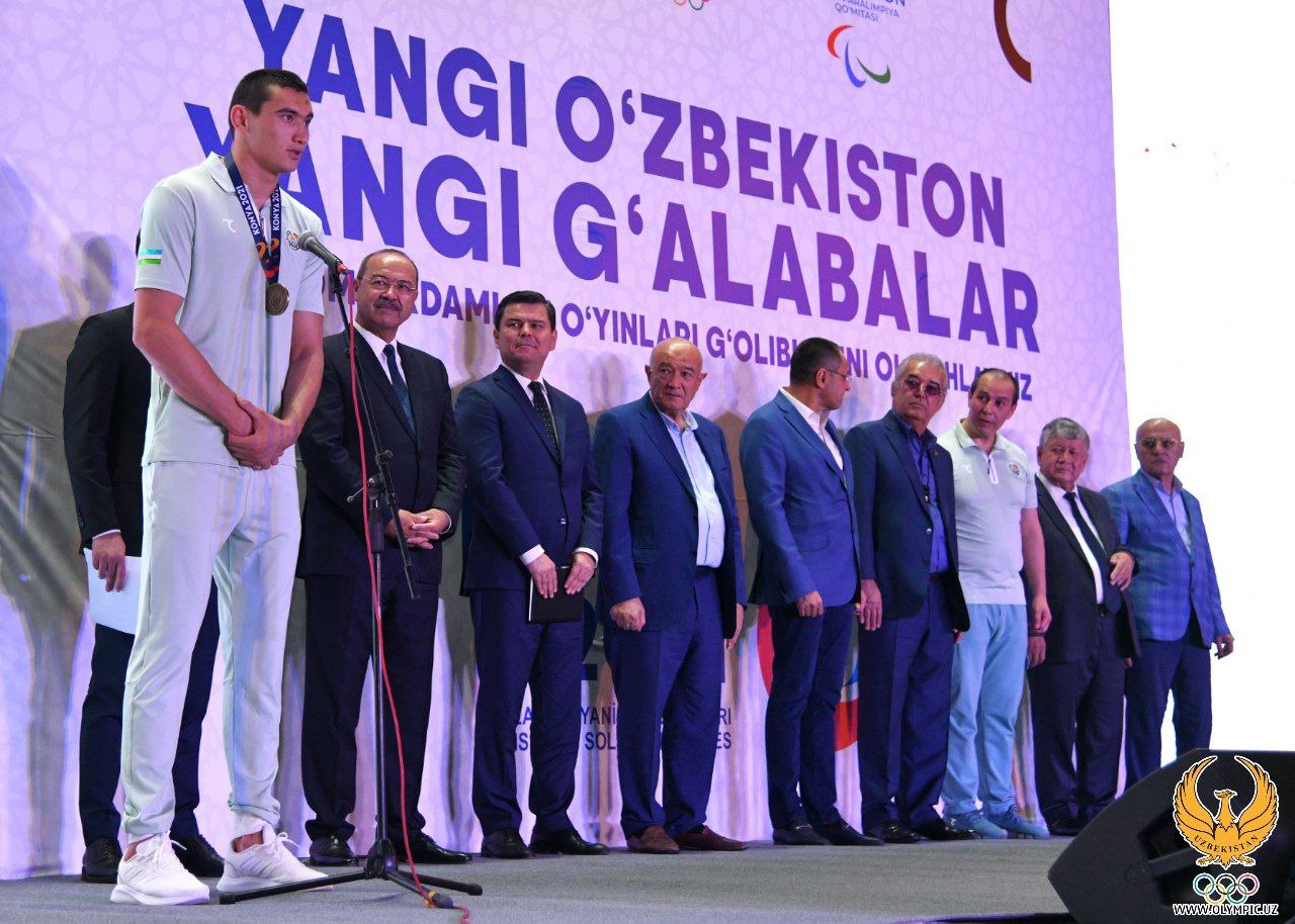 В свою очередь, от имени наших спортсменов выступили победитель соревнований по дзюдо Музаффар Турабоев и чемпионка по лёгкой атлетике Шарифа Давронова, от имени наставников-главный тренер сборной Узбекистана по тяжёлой атлетике Бахром Мендибоев. Они в свою очередь, остановились на том, что за этими победами стоит то высокое внимание, которое уделяется уважаемым Президентом и государством спорту. Выступившие на мероприятии пообещали достойно защищать честь Родины на международной арене, и в дальнейшем оправдывая оказанное им доверие.