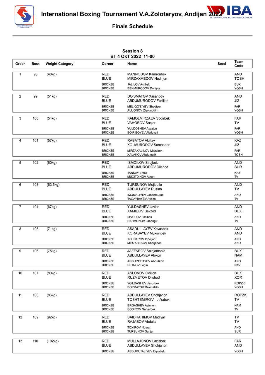 Сегодня в международном турнире по боксу, посвящённом памяти В.А.Золотарёва, который проходит в Андижане определятся победители. По итогам полуфинальных боёв такие именитые мастера кожаной перчатки, как Абдумалик Халаков, Икболжон Холдоров, Санжар Турсунов не смогли выйти в финал. Имена финалистов, которые будут бороться за золотые награды, выглядят следующим образом: