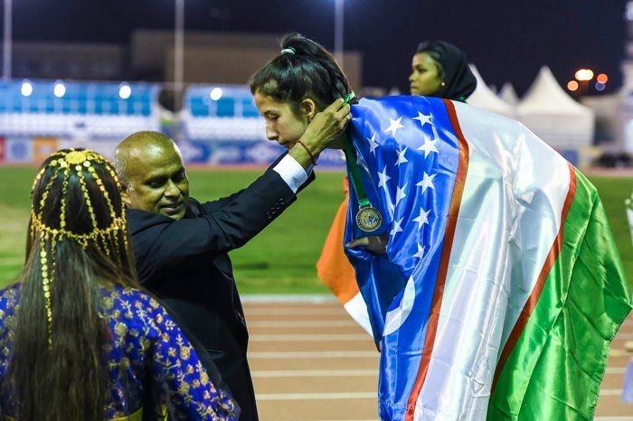 В этом году Шарифа Давронова, достойно представляющая честь Узбекистана на международной арене, завоевала ещё один чемпионский титул. На континентальном первенстве среди молодёжи в Кувейте наша соотечественница показала лучший результат в тройном прыжке.