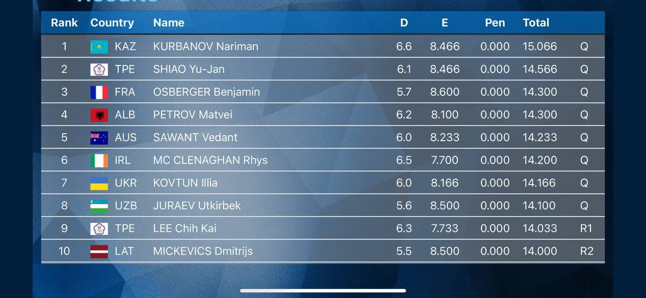 Наш соотечественник успешно прошёл отборочный этап с коэффициентом уровня сложности 5,6. Его выступление было оценено судьями в 14 100 баллов и вошёл в восьмёрку лучших. Финал этой программы запланирован на 12 марта.