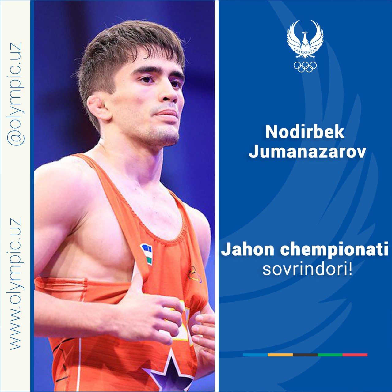 Хорошие новости с Иордании. Узбекский борец вольного стиля Нодирбек Джуманазаров завоевал бронзовую медаль. В поединке за третье место наш соотечественник одолел Сагар Сагар из Индии со счётом 10:0.