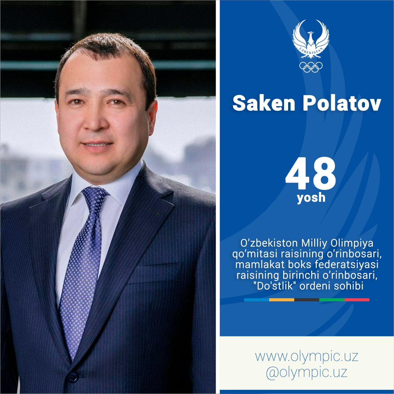 Сегодня заместитель председателя Национального Олимпийского комитета Узбекистана, первый заместитель председателя Федерации бокса страны, кавалер ордена «Дустлик» Сакен Полатов отмечает свой День рождения. НОК Узбекистана поздравляет Сакена Жетибаевича с Днём рождения, желает ему крепкого здоровья и долгих лет жизни.
