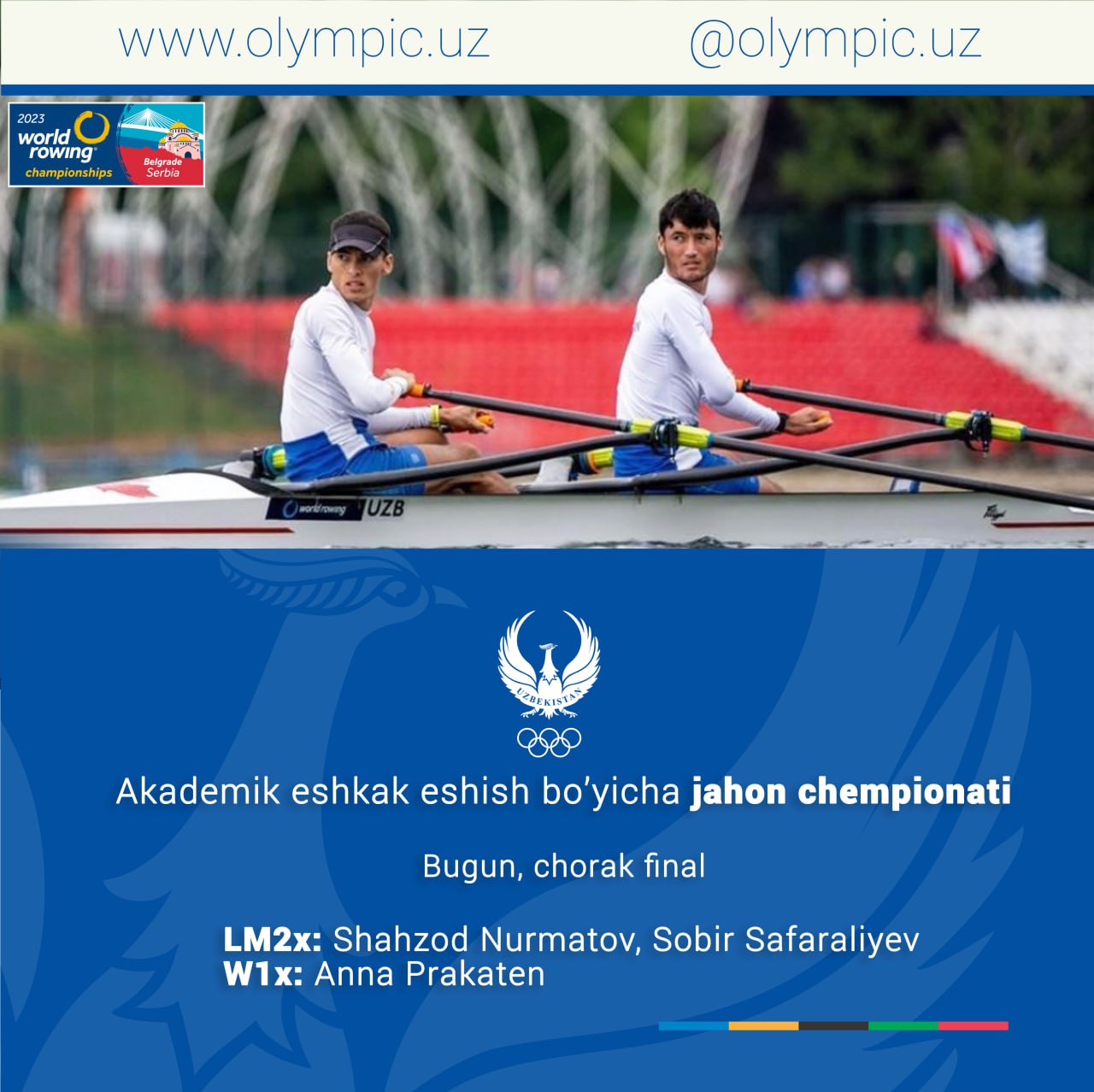 На чемпионате мира по академической гребле в Сербии сегодня состоятся четвертьфинальные заплывы. Как мы сообщали ранее, на этот этап вышли представители сборной Узбекистана, участвующие в 2 программах. Сегодня Шахзод Нурматов и Собир Сафаралиев стартуют в паре среди спортсменов лёгкой весовой категории, а Анна Пракатен - в одиночке.