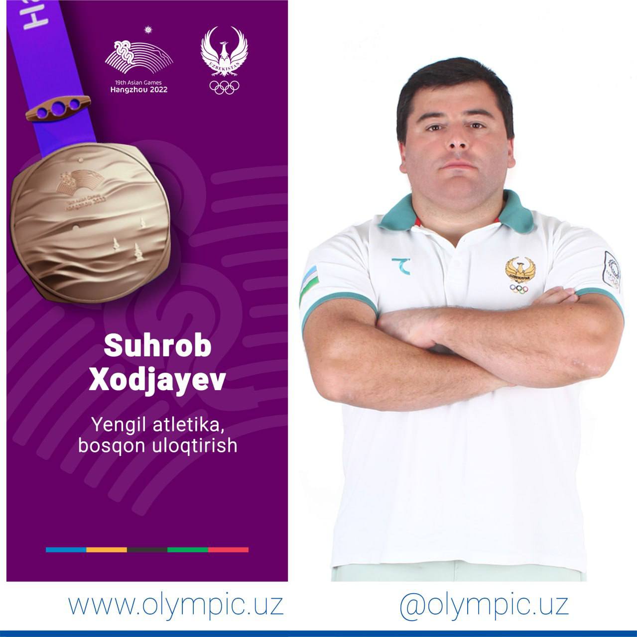Сборная Узбекистана по легкой атлетике поплнила копилку нашей делегации первой медалью по данной дисциплине. Сухроб Ходжаев, участвовавший в секторе метания молота, показал результат 70,79 метра. Золотые и серебряные медали в этой программе достались представителям Китая и Катара соответственно.