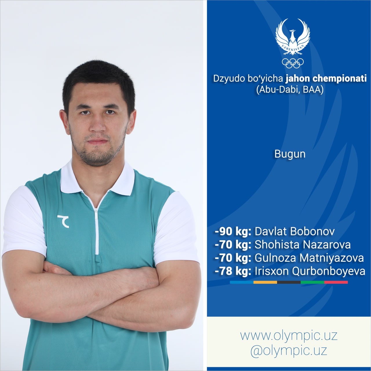 В Абу-Даби продолжается чемпионат мира по дзюдо. В рамках сегодняшнего дня 4 представителя сборной Узбекистана будут оспаривать медали. Наши дзюдоисты своё участие на чемпионате начнут против следующих спортсменов :