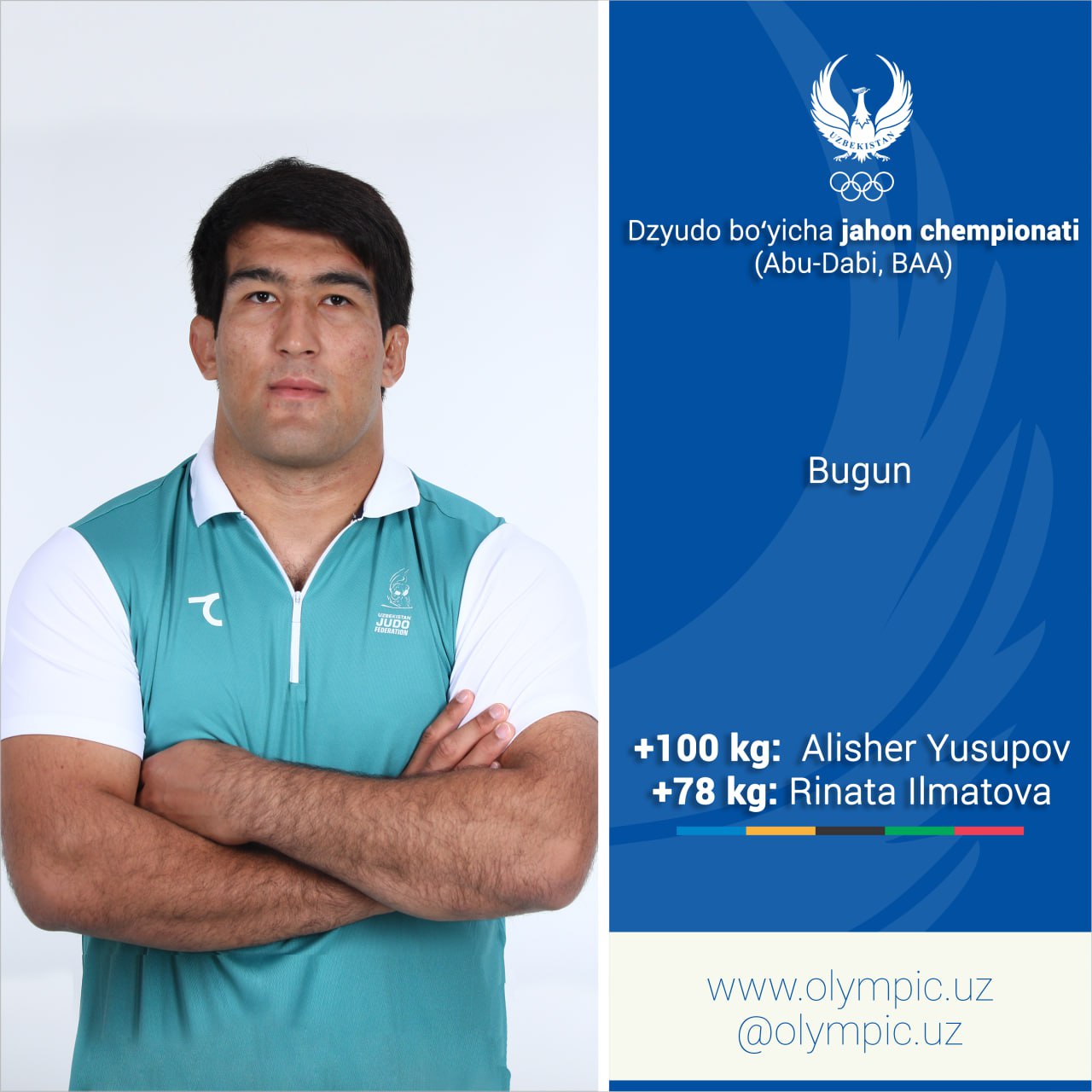 Сегодня на чемпионате мира по дзюдо в Абу-Даби завершатся выступления спортсменов в индивидуальном направлении. В течение дня на татами выйдут дзюдоисты в самой тяжёлой весовой категории. От имени Узбекистана выступят Рината Илматова и бронзовый призёр первенства мира прошлого года Алишер Юсупов. Наши соотечественники в первом этапе проведут схватку против следующих соперников: