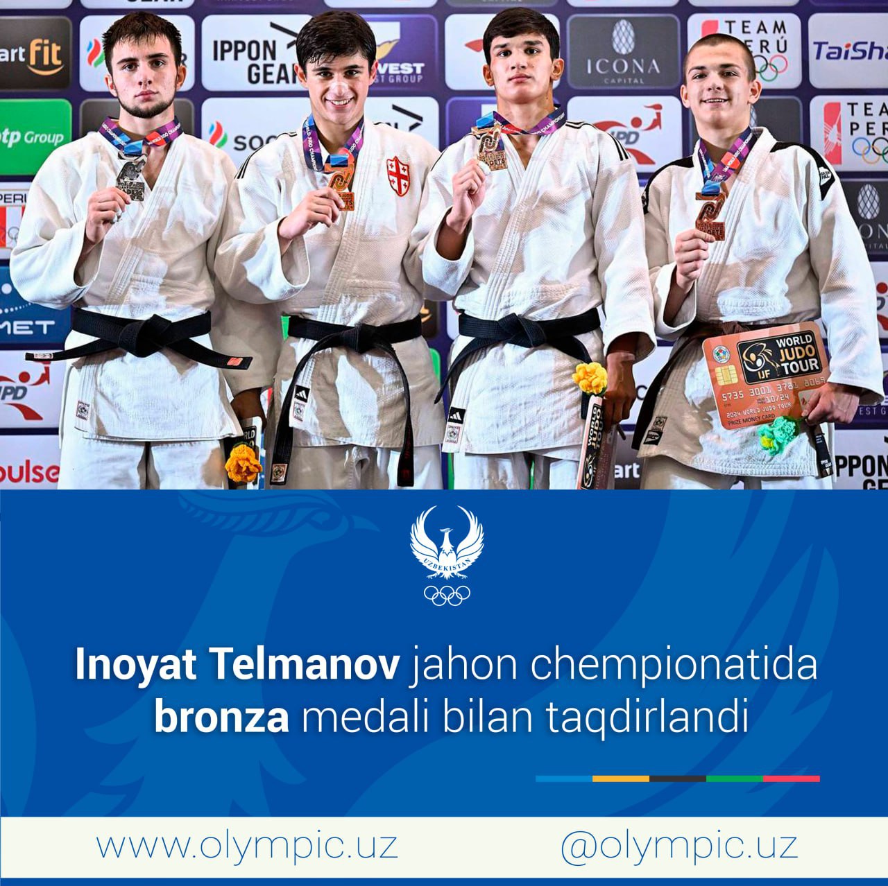 На чемпионате мира по дзюдо среди юниоров в Перу делегация Узбекистана завоевала свою первую награду. Автором бронзовой медали стал Иноят Тельманов, выступавший в весовой категории -66 кг.