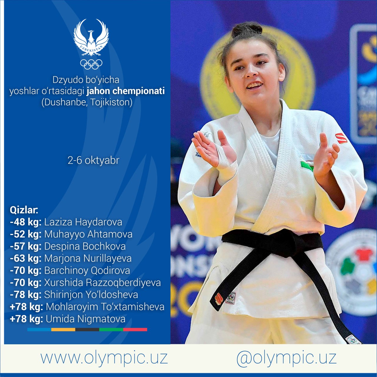 2-6 октября в столице Таджикистана состоится молодёжный чемпионат мира по дзюдо. Ожидается, что в этом мировом первенстве примут участие около 450 спортсменов из 60 стран мира, в том числе и представители сборной Узбекистана. Как сообщает Федерация дзюдо страны, в соревнованиях выступят следующие спортсмены: