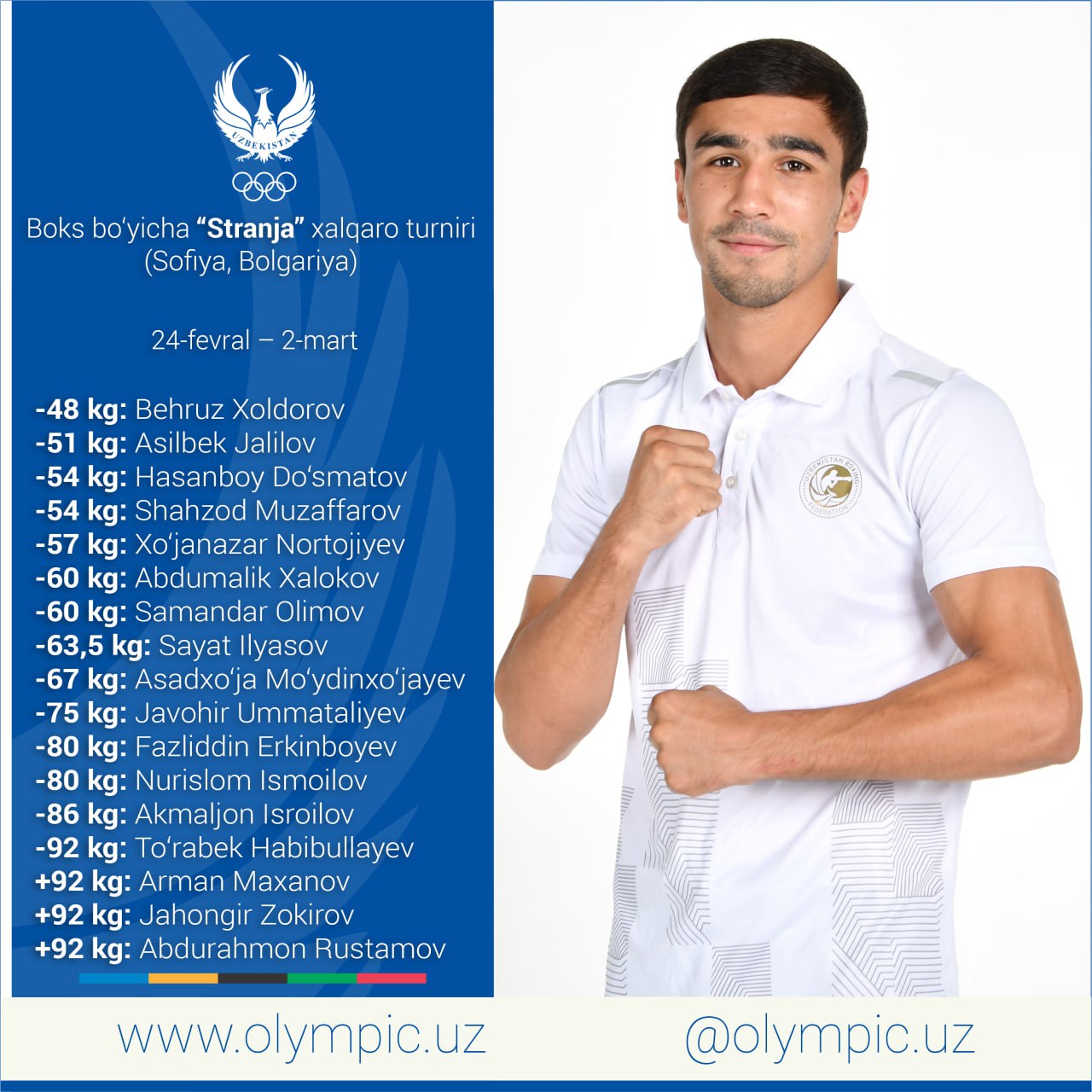 С 24 февраля по 2 марта в городе София Болгарии состоится международный турнир "Странджа", известный как малый чемпионат мира по боксу. Федерация бокса Узбекистана объявила имена мастеров кожаных перчаток, которые выступят в данном старте. Следует отметить, что среди участников мы можем увидеть таких Олимпийских чемпионов, как Хасанбой Дусматов, Абдумалик Халоков, Асадхуджа Муйдинхуджаев. Полный состав выглядит следующим образом: