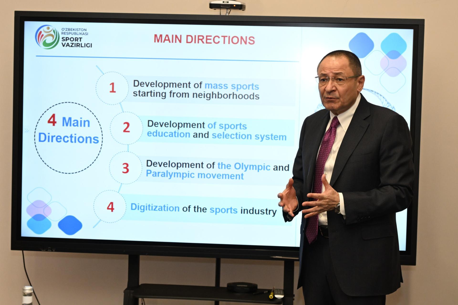 Во время беседы особое внимание было уделено обмену опытом между двумя странами в области спортивной науки, запуску совместных образовательных программ для студентов и специалистов, а также внедрению современных методик подготовки и развитию спортивной медицины. Стороны подчеркнули, что подобное сотрудничество будет способствовать дальнейшему развитию науки и образования в сфере спорта в Узбекистане, а также укреплению международных связей.