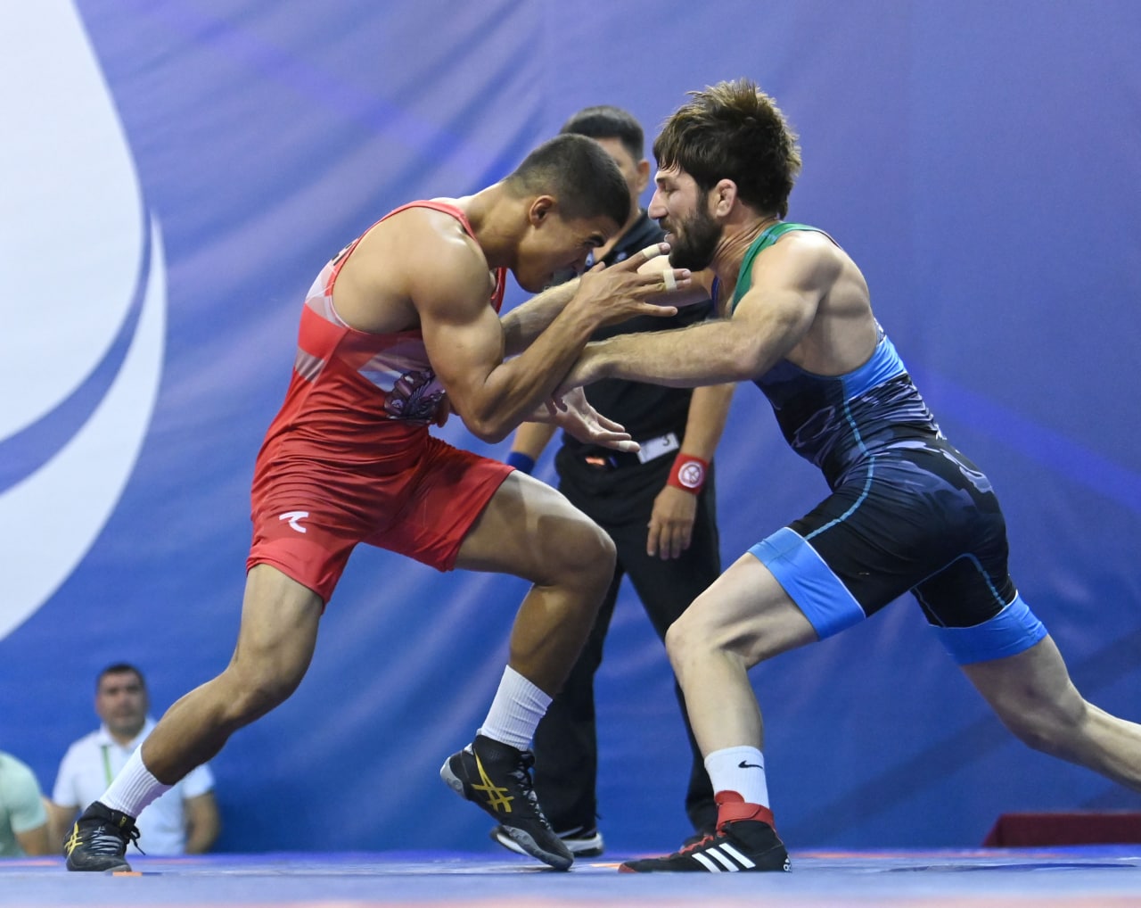 Стартовали поединки вечерней программы по спортивной борьбе. В весе до 55 кг Джасур Ортикбоев (греко...
