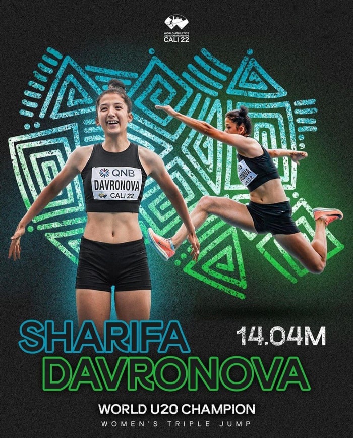 Колумбиянинг Кали шаҳрида енгил атлетика бўйича ёшлар ўртасидаги (U20) жаҳон чемпионати бўлиб ўтмоқда. Унда уч ҳатлаб сакраш дастурида иштирок этган ҳамюртимиз Шарифа Давронова 14.02 метр натижа билан ғалаба қозонди. Давронова ҳали 15 ёшда бўлиб, энг яқин таъқибчисини 66 смга ортда қолдирди. Шунингдек, унинг натижаси U20 таснифида мавсумнинг энг яхши кўрсаткичи бўлди. Тасанно, Шарифа!