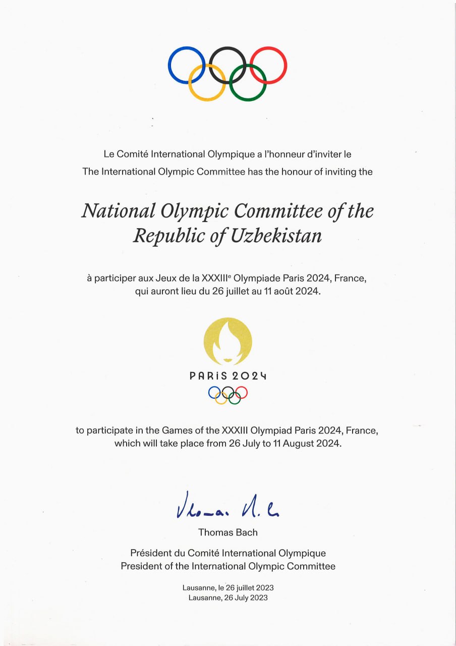 Халқаро Олимпия қўмитаси Ўзбекистон Миллий Олимпия қўмитасига келаси йилнинг 26 июль – 11 август кунлари бўлиб ўтадиган Париж-2024 XXXIII ёзги Олимпия ўйинларида иштирок этиш учун расмий таклифнома жўнатди.