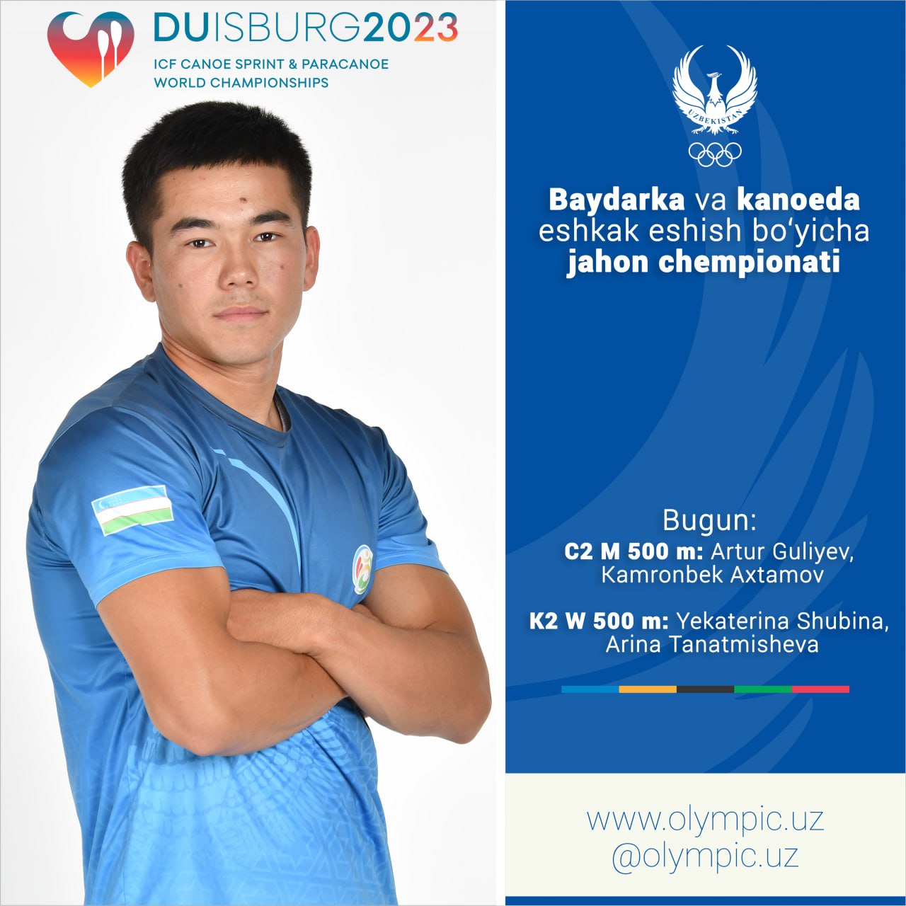 Байдарка ва каноэда эшкак эшиш бўйича жаҳон чемпионати қизғин давом этмоқда. Германиянинг Дуйсбург шаҳри мезбонлик қилаётган мусобақанинг бугунги кунида ҳамюртларимиз Олимпия ўйинлари дастурига киритилган 2 та йўналишда ярим финал босқичида стартга чиқишади.