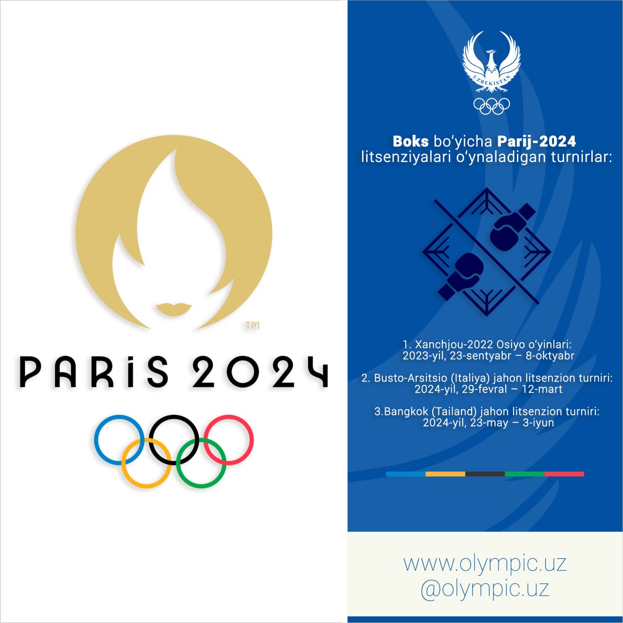 Халқаро Олимпия қўмитаси бокс бўйича Париж-2024 Олимпиадасига йўлланма берувчи мусобақалар тақвимини расман эълон қилди. Унга кўра, ҳамюртларимиз қуйидаги лицензион мусобақаларда Олимпиада йўлланмалари учун кураш олиб боришади: