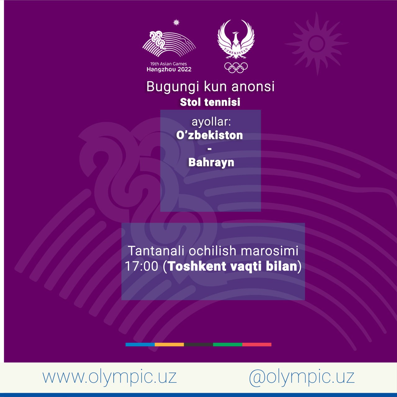 Ханчжоу-2022: Бугун XIX ёзги Осиё ўйинларининг тантанали очилиш маросими бўлиб ўтади. Шу боис, спорт турларида беллашувлар деярли ўтказилмайди. Ҳамюртларимиздан стол теннисчи қизларимиз жамоавий дастурда Баҳрайнга қарши навбатдаги тур учрашувини ўтказишади. Тантанали очилиш маросими эса Тошкент вақти билан соат 17:00 да бошланади.