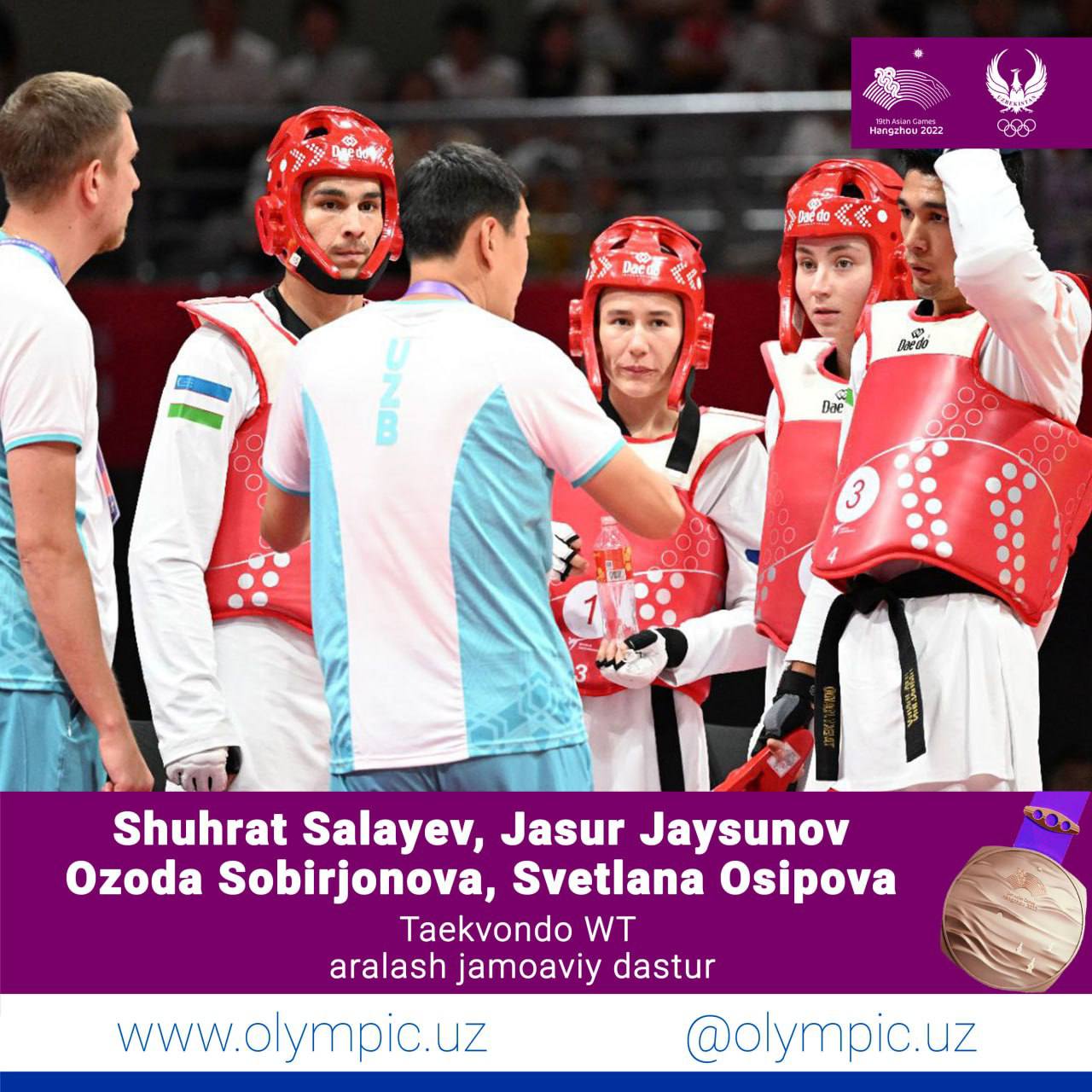 Таэквондо WT бўйича Ўзбекистон терма жамоаси аралаш жамоавой дастурда бронза медалини қўлга киритди. Ярим финалда Жанубий Кореяга қарши баҳс олиб борган спортчиларимиз 47:48 ҳисобида имкониятни бой бериб қўйишди. Ушбу натижа орқали таэквондочиларимиз бронза медалига сазовор бўлдилар. Терма жамоа таркиби: Шуҳрат Салаев, Жасур Жайсунов, Озода Собиржонова, Светлана Осипова.