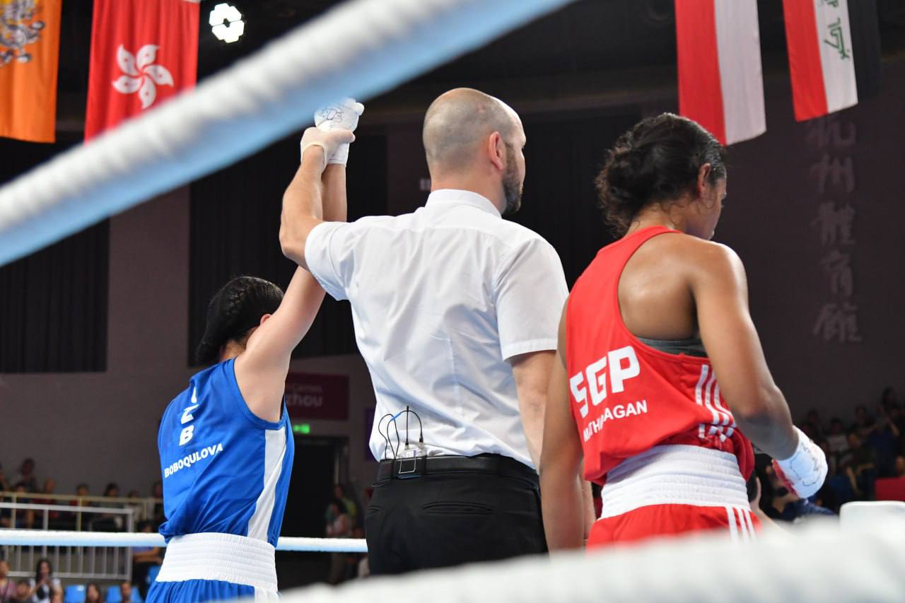 Бокс бўйича Ўзбекистон терма жамоаси аъзоси Сабина Бобоқулова (-50 кг) навбатдаги босқичга йўл олди. Сингапурлик До Данишига қарши баҳс олиб борган Бобоқулова 5:0 ҳисобидаги ғалабани расмийлаштирди.