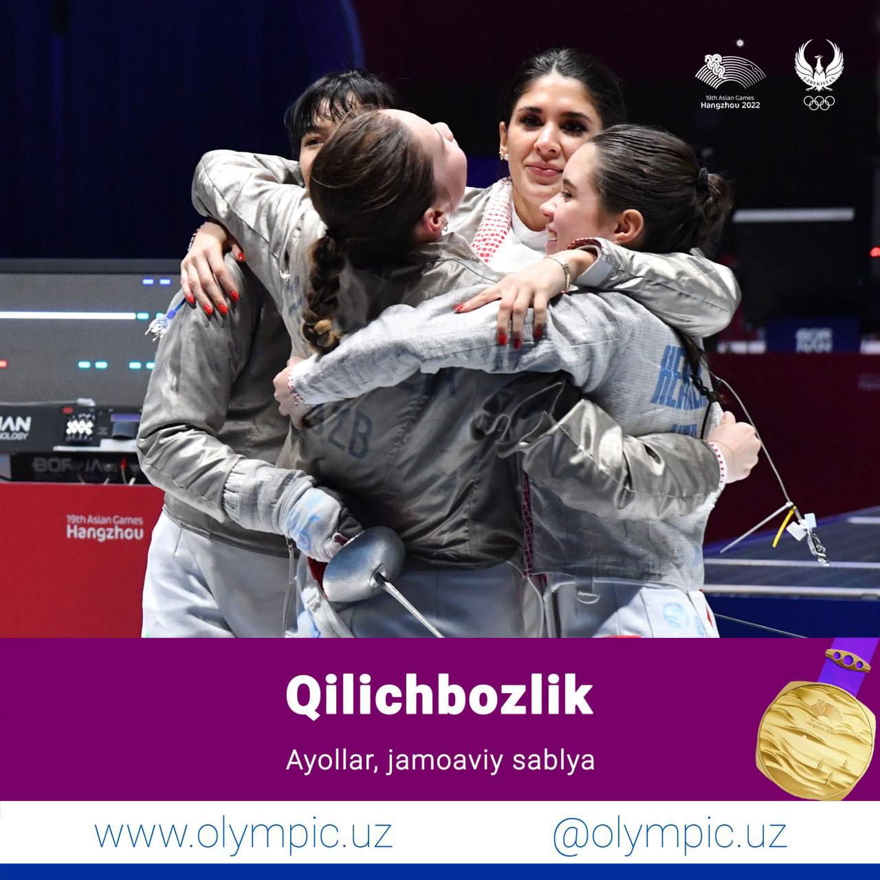 Қиличбозликнинг сабля йўналиши бўйича Ўзбекистон аёллар терма жамоасидан ажойиб ғалаба. Ҳамюртларимиз шиддатли руҳда кечган финал жангида япониялик рақибларини мағлубиятга учратиб, Осиё ўйинлари чемпионига айланишди. Бу қиличбозлик спортида Осиё ўйинларида қўлга киритилган биринчи олтин медаль. Баракалла, қизлар!